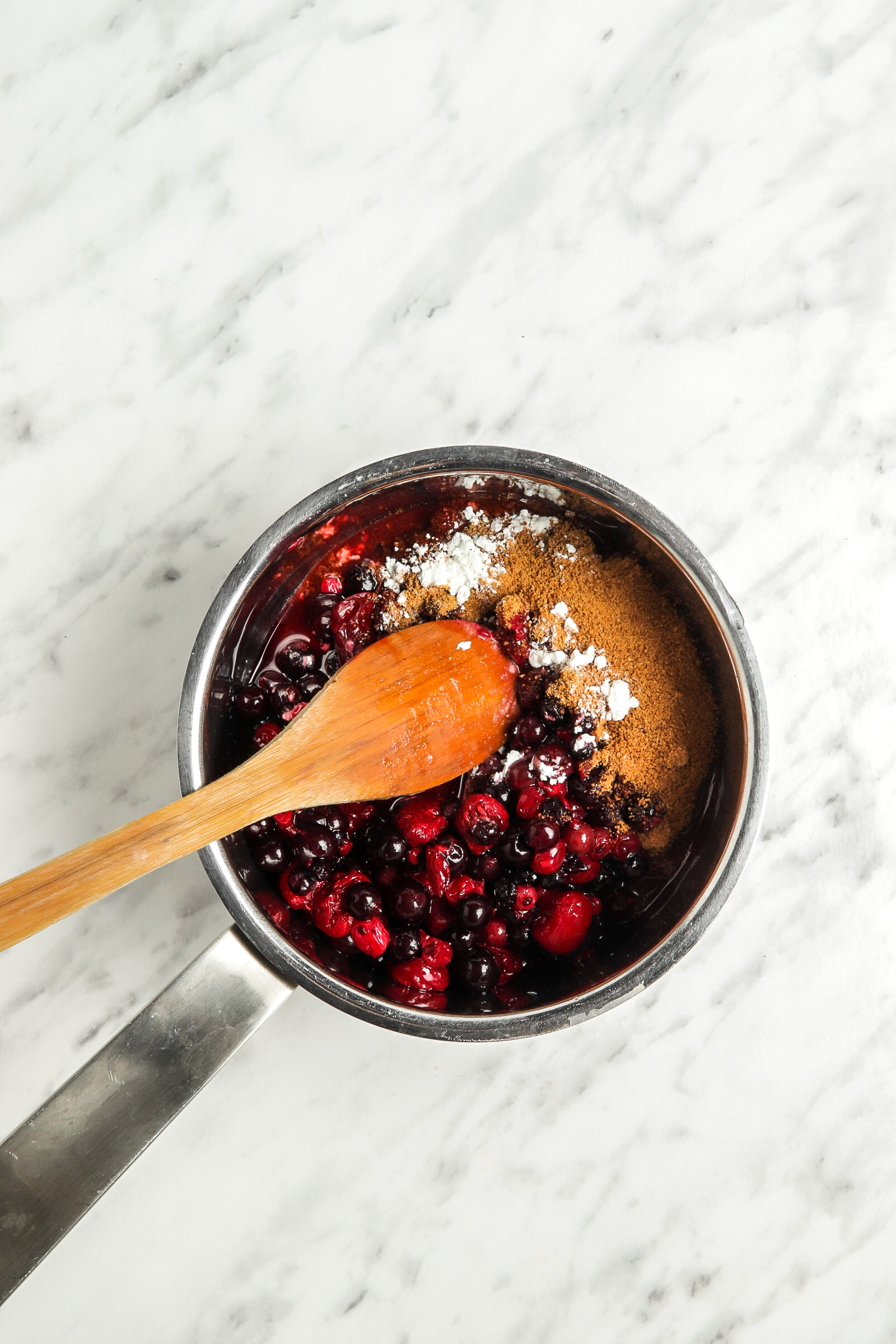 - Over medium-low heat, add to a saucepan the raspberries, blueberries, sugar, lemon juice, and cornstarch.